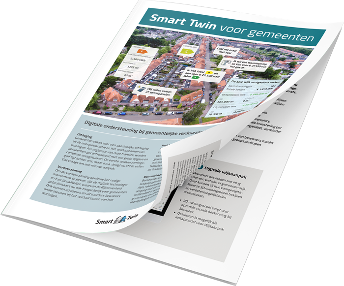 Het Smart Twin platform helpt gemeenten bij de energietransitie. Het biedt volstrekt unieke software voor het genereren van een digitale tweeling (digital twin) van iedere woning in je gemeente. Deze bouwkundige modellen kunnen verder worden verrijkt door adviseurs, bewoners en nieuwe databronnen. Dat zorgt voor een zeer hoge mate van nauwkeurigheid en hiermee ontstaat een bijzonder gedetailleerd beeld van de verbetermogelijkheden van gebouwen.